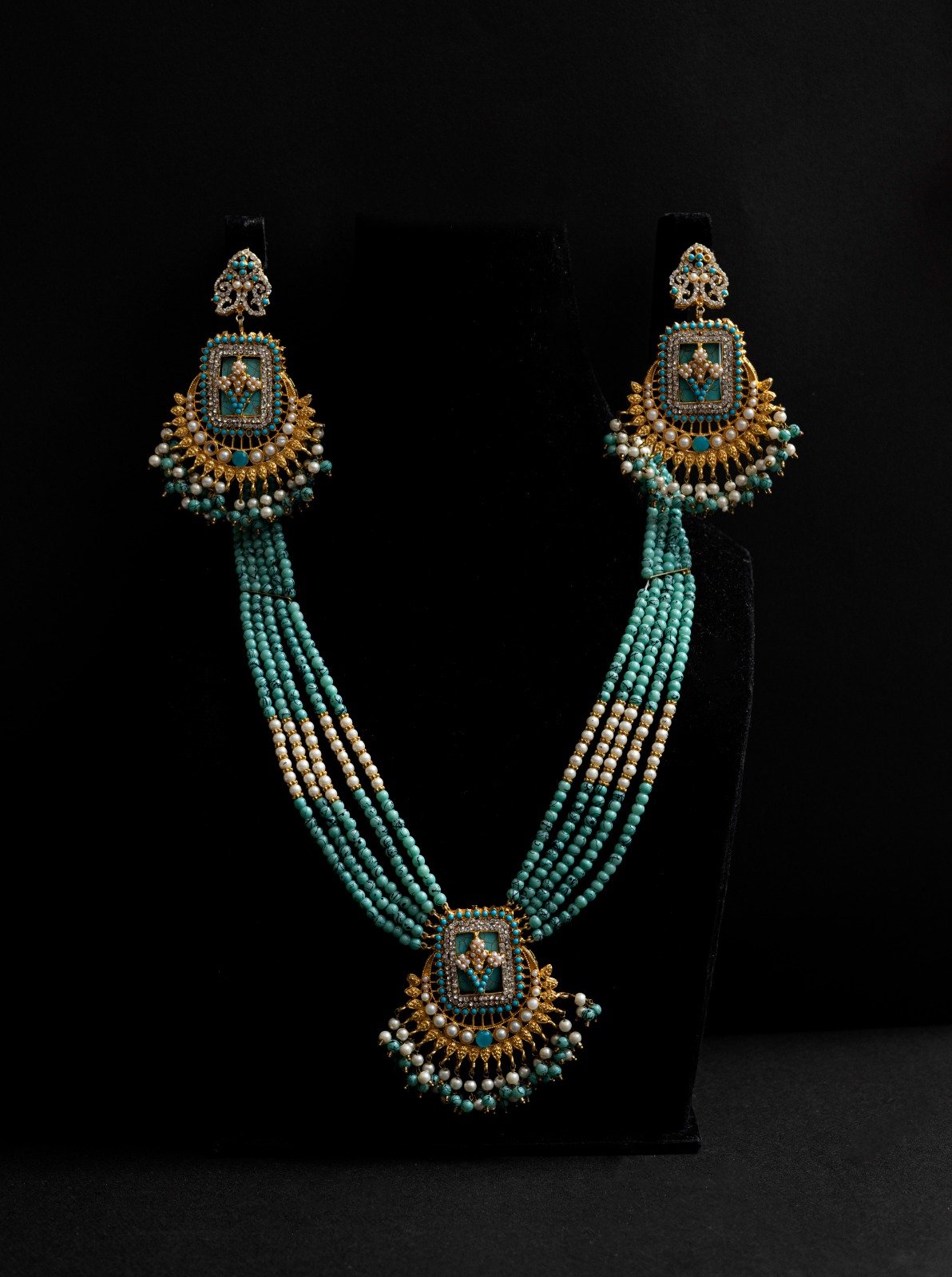 This stunning necklace set exudes luxury and sophistication, featuring an intricate design adorned with sparkling gemstones and lustrous pearls. The necklace’s delicate filigree pattern and ornate details create a regal look, while the matching earrings add a touch of glamour with their precise craftsmanship. Perfect for formal events, weddings, or special occasions, this beautiful necklace set is sure to make a statement and elevate any outfit with its timeless elegance and refinement.