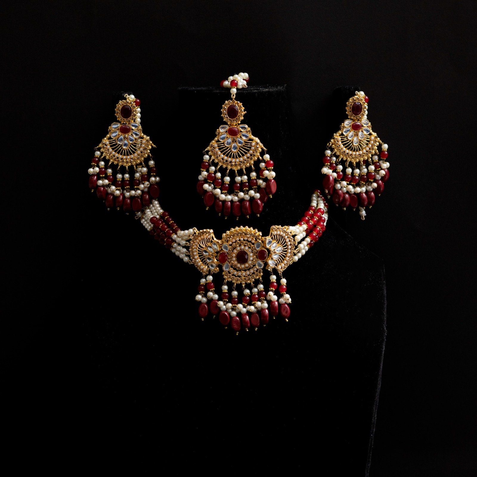 This gorgeous necklace set dazzles with intricate craftsmanship and sparkling gemstones. The necklace features a stunning floral motif, adorned with vibrant crystals and delicate filigree details that add a touch of regal elegance. The matching earrings boast a similar design, with dangling drops that catch the light and shimmer beautifully. Perfect for weddings, parties, or any special occasion, this necklace set exudes luxury and sophistication, making the wearer feel like royalty. Its timeless design ensures it will be treasured for years to come.